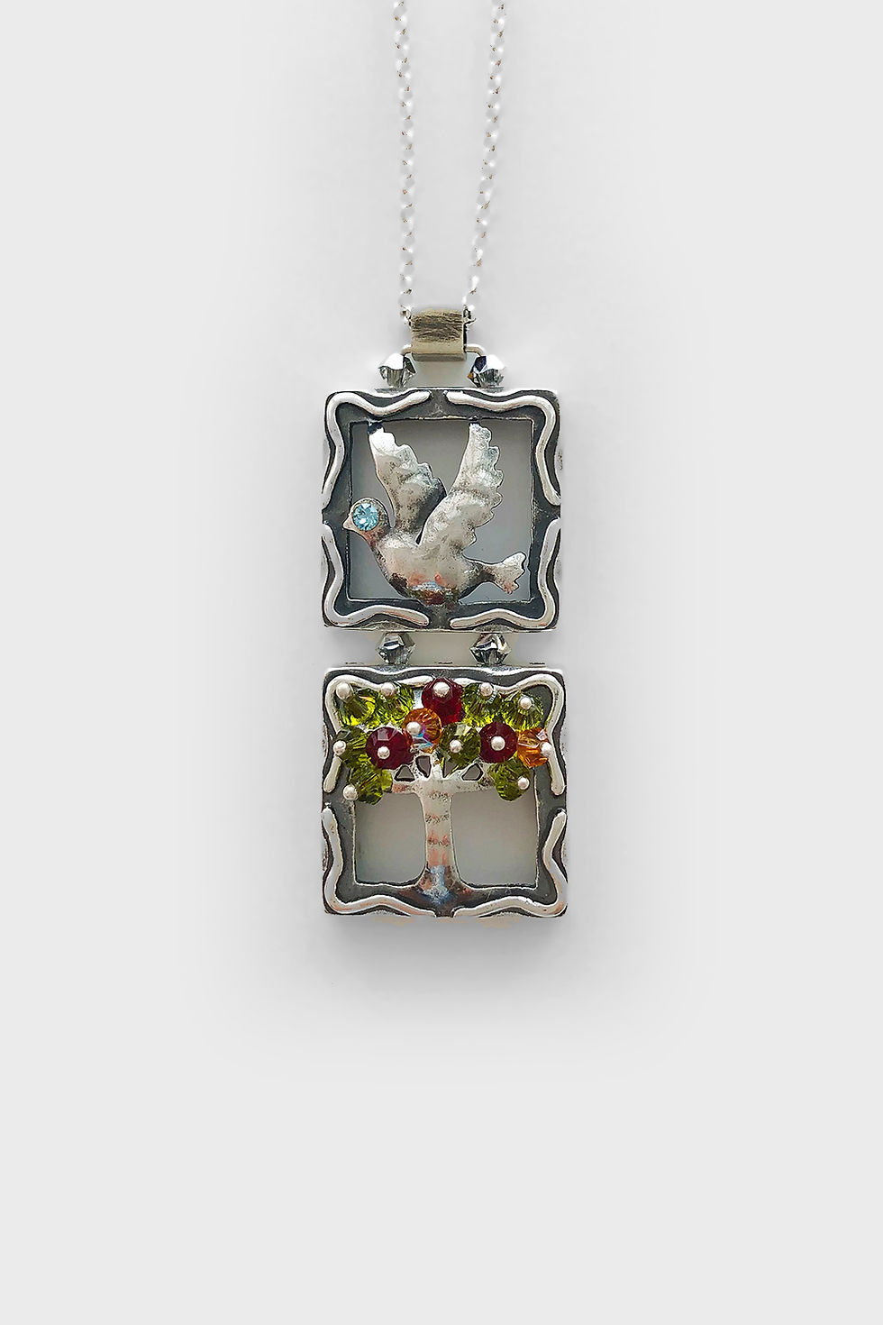 Sterling Silver Squares Necklace Heart Tree Pom.