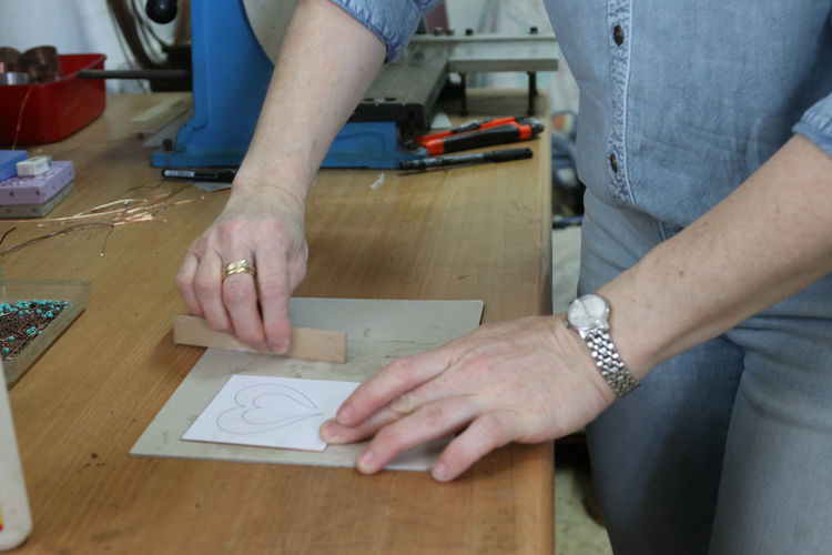 The copper goes through a hammering and embossing process where it gets its shiny texture. Slowly, the symbols become three-dimensional and look almost alive.